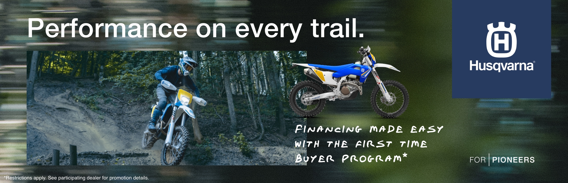 *Terms and Conditions: An introductory rate of 0% APR for 3 months, and then a post-introductory rate of 5.99% APR* for up to 48 months will apply (to tier 1 qualified buyers only). Offer applies to select 2026, 2025 and 2024 Husqvarna off-road model motorcycles (2026: Husqvarna EE 2; TC 50, 65, 85 (17/14 & 19/16), 125, 250; TX 300; TE 150, 250, 300; FE 350s, 450, 501s / 2025: Husqvarna EE 2; TC 50, 65, 85 (17/14 & 19/16), 125, 125 Heritage, 150, 150 Heritage, 250, 250 Heritage, 300, 300 Heritage; FC 250, 350, 350 Heritage, 450, 450 Factory; TX 300, 300 Heritage; FX 350, 350 Heritage; TE 150, 250, 300, 300 Heritage, 300 PRO; FE 350s, 350s Heritage, 450, 450 Heritage, 501s, 501s Heritage / 2024: Husqvarna TC 50, 65, 85 (17/14 & 19/16), 125, 250; FC 250, 250 Rockstar, 350, 450, 450 Rockstar; TX 300; FX 350, 450; TE 150, 250, 300, 300 PRO; FE 350s, 350w, 450, 501s, 501w) and street (2026: Husqvarna 701 Supermoto / 2025: Husqvarna Svartpilen 801; Vitpilen 801; Norden 901; Norden 901 Expedition / 2024: Husqvarna Svartpilen 401; Vitpilen 401; 701 Supermoto; 701 Enduro; Norden 901; Norden 901 Expedition). Example: A total 51-month term with an amount financed of $10,000: 0% rate for the first 3 months and 5.99% rate for remaining 48 months requires monthly payments of $196.08 for the first 3 months, and $220.99 for the remaining 48 months. Program minimum amount financed is $2,500 and 0% - 10% down payment required. Rate and down payment based on credit approval criteria. Offer valid January 1, 2026, through February 28, 2026, and is subject to credit approval by Synchrony Bank. Please see your authorized Husqvarna dealer for all program details.