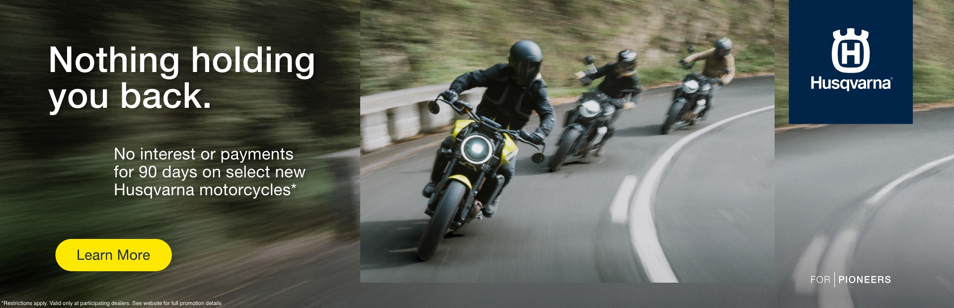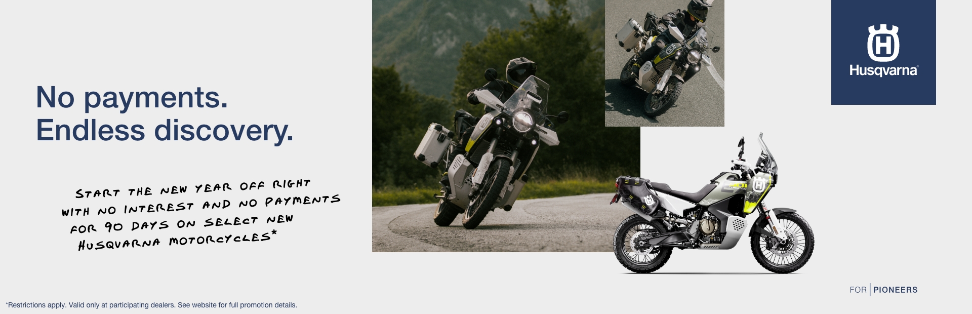 *Terms and Conditions: The “No No for 90” applies to new, untitled and unregistered 2026, 2025 and 2024 Husqvarna off-road (2026: Husqvarna EE 2; TC 50, 65, 85 (17/14 & 19/16), 125, 250; TX 300; TE 150, 250, 300; FE 350s, 450, 501s / 2025: Husqvarna EE 2; TC 50, 65, 85 (17/14 & 19/16), 125, 125 Heritage, 150, 150 Heritage, 250, 250 Heritage, 300, 300 Heritage; FC 250, 350, 350 Heritage, 450, 450 Factory; TX 300, 300 Heritage; FX 350, 350 Heritage; TE 150, 250, 300, 300 Heritage, 300 PRO; FE 350s, 350s Heritage, 450, 450 Heritage, 501s, 501s Heritage / 2024: Husqvarna TC 50, 65, 85 (17/14 & 19/16), 125, 250; FC 250, 250 Rockstar, 350, 450, 450 Rockstar; TX 300; FX 350, 450; TE 150, 250, 300, 300 PRO; FE 350s, 350w, 450, 501s, 501w) and street (2026: Husqvarna 701 Supermoto / 2025: Husqvarna Svartpilen 801; Vitpilen 801; Norden 901; Norden 901 Expedition / 2024: Husqvarna Svartpilen 401; Vitpilen 401; 701 Supermoto; 701 Enduro; Norden 901; Norden 901 Expedition) model motorcycles. Financing offer available through Freedom Road Financial (FRF), a loan production center of Old Second Bank, Member FDIC. Annual Percentage Rate (APR) of 5.99% for 48-month term offer is available to qualified applicants only. Not all buyers will qualify and if approved may receive a higher rate and no interest free, payment free period; depending on credit score. Some buyers will require a down payment in order to receive credit approval. No interest for 90 days from contract date and no payments for 120 days from contract date, interest begins to accrue 90 days from contract date. Subject to model availability and dealer participation. Not all buyers will qualify and if approved may receive a higher rate and higher payment, depending on credit score. Some buyers will require a higher down payment in order to receive credit approval. Other charges may apply. Subject to model availability and dealer participation. Subject to credit approval by FRF, not all applicants will qualify. Financing offer can change or be cancelled at any time. Offer valid January 1, 2026, through February 28, 2026. This offer cannot be combined with any other offers. Finance offer valid through authorized Husqvarna dealers only. See local authorized dealer for details.