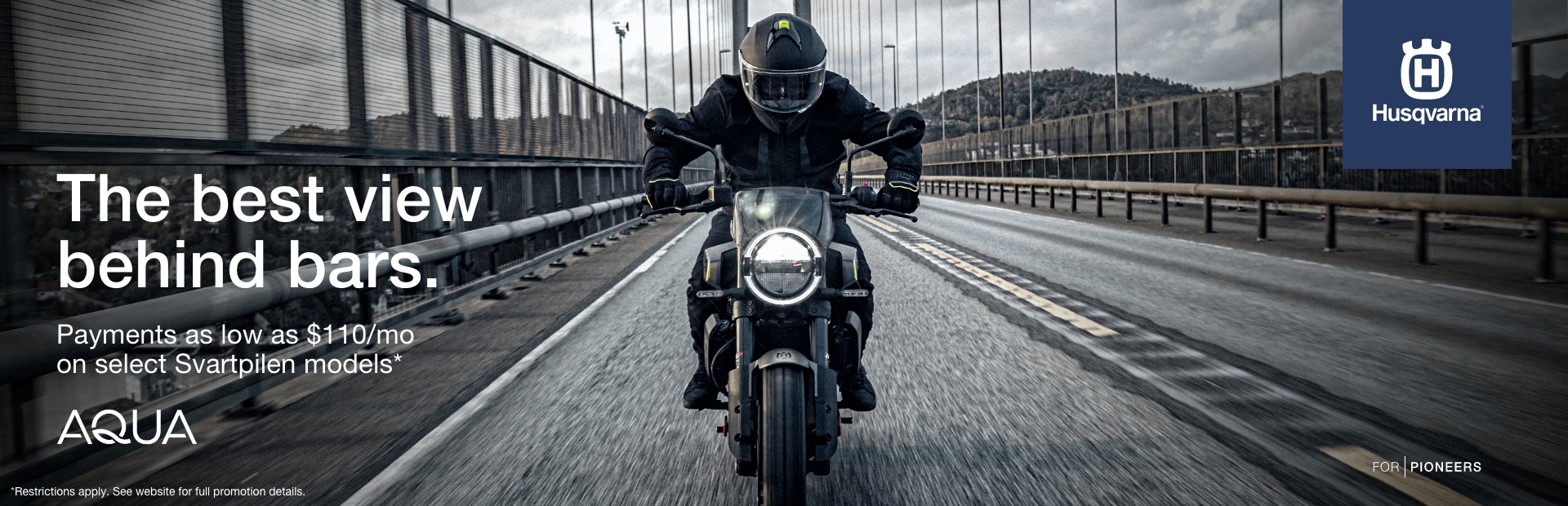Beginning January 1, 2026, and running through February 28, 2026, qualified customers can take advantage of some exciting offers from Aqua Finance on the purchase of select new Svartpilen 401 Husqvarna street models. Customers can receive special retail financing as low as 10.99% APR* for up to 96 months on the purchase of select new model year 2024 Husqvarna street model motorcycles.