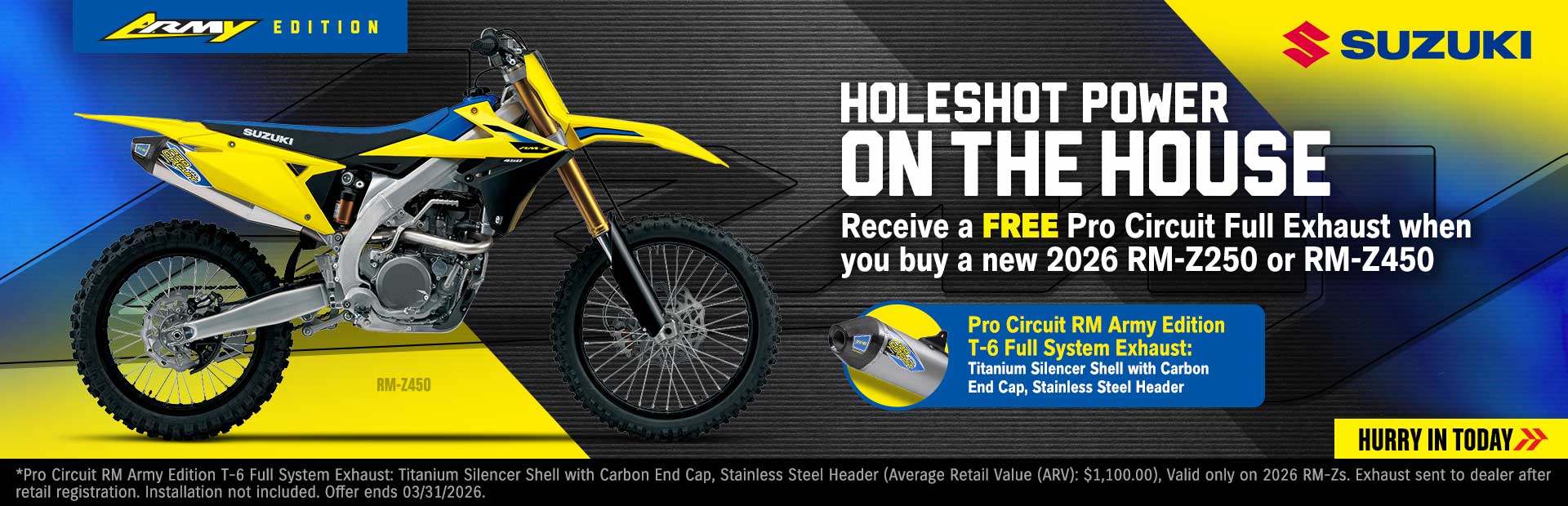 *Conditions apply. This offer is valid for $250 factory customer cash off a new, unregistered 2023-2026 Suzuki motorcycle, scooter, or ATV model. Discount is taken off of listed price and is contingent on model availability. Offer must be validated by participating authorized dealer at time of purchase. May be combined with other current retail incentives so long as all conditions are met. No substitutions. Offer applicable to active and retired first responders in law enforcement, fire and rescue services, or emergency medical services (First Responder) or an active or retired member of the United States Armed Forces (Military). Military and first responders may be required to provide verification of status. See dealer for eligibility. Not redeemable for cash. Offers void where prohibited. Only valid in the continental United States, excluding HI. See your local Suzuki dealer for complete details. Offer valid between 01/01/2026 and 03/31/2026.