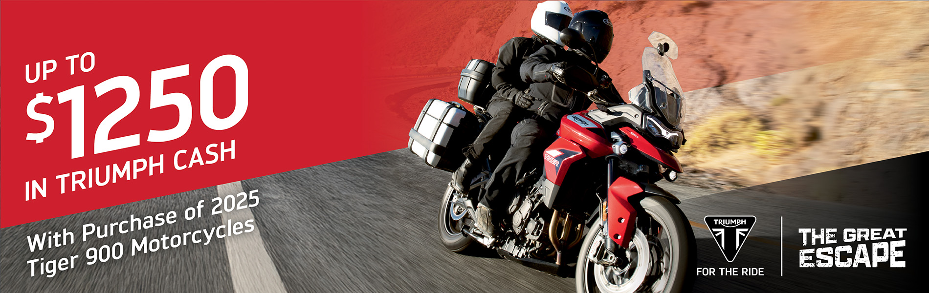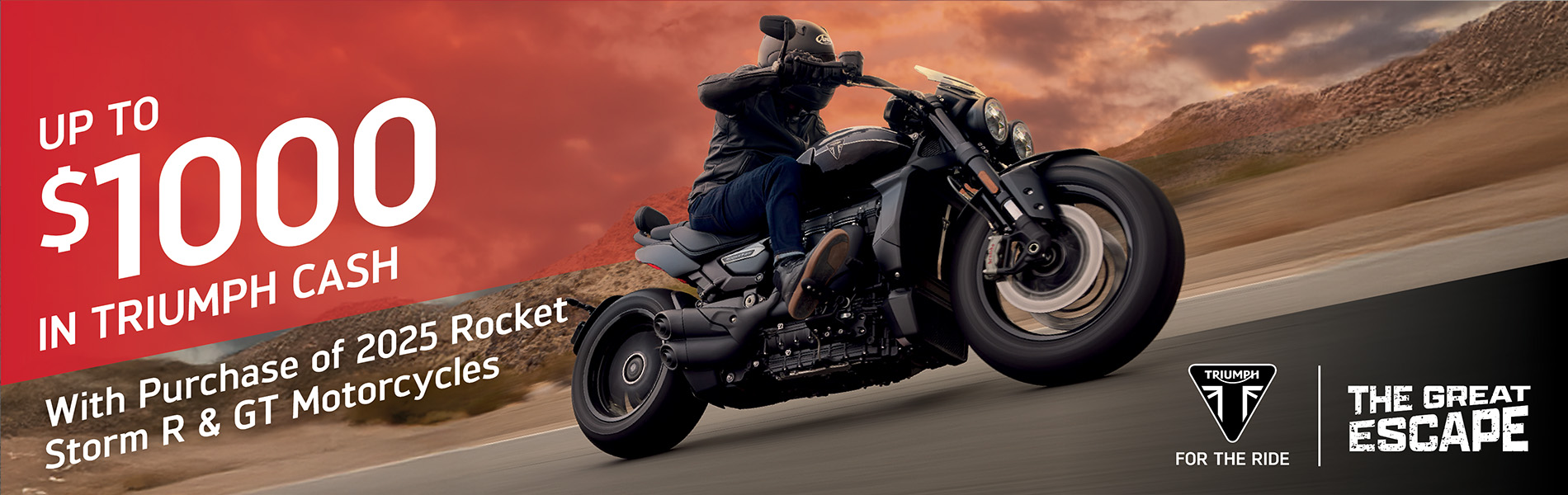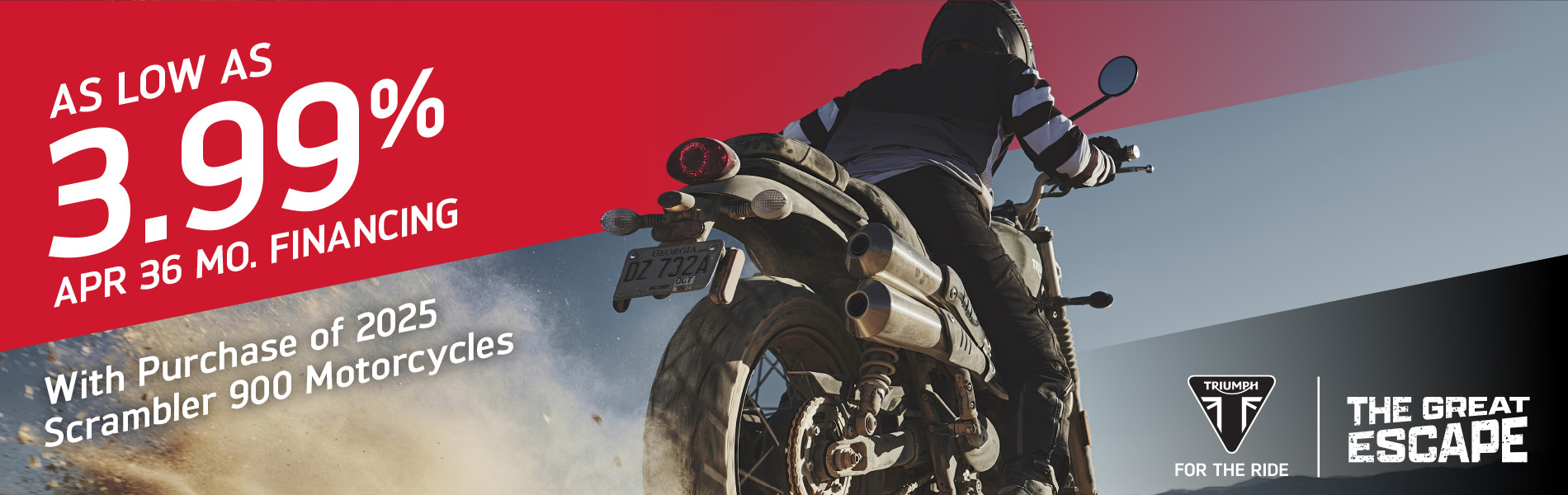 The Great Escape promotion offers bold incentives for riders to escape high interest rates on the purchase of a new Triumph motorcycle, with the lowest financing rates in the industry.
